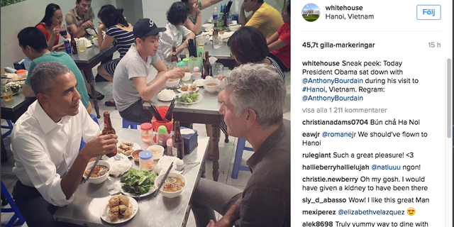 ประธานาธิบดีบารัค โอบามา ของสหรัฐฯเจียดเวลาจากการปฏิบัติภารกิจเยือนเวียดนามอย่างเป็นทางการ เพื่อแวะไปลิ้มลองอาหารเวียดนามขนานแท้ที่ร้านอาหารข้างทางแห่งหนึ่งกับ แอนโธนี บูร์แดง เชฟและพิธีกรรายการอาหารชื่อดังชาวอเมริกัน