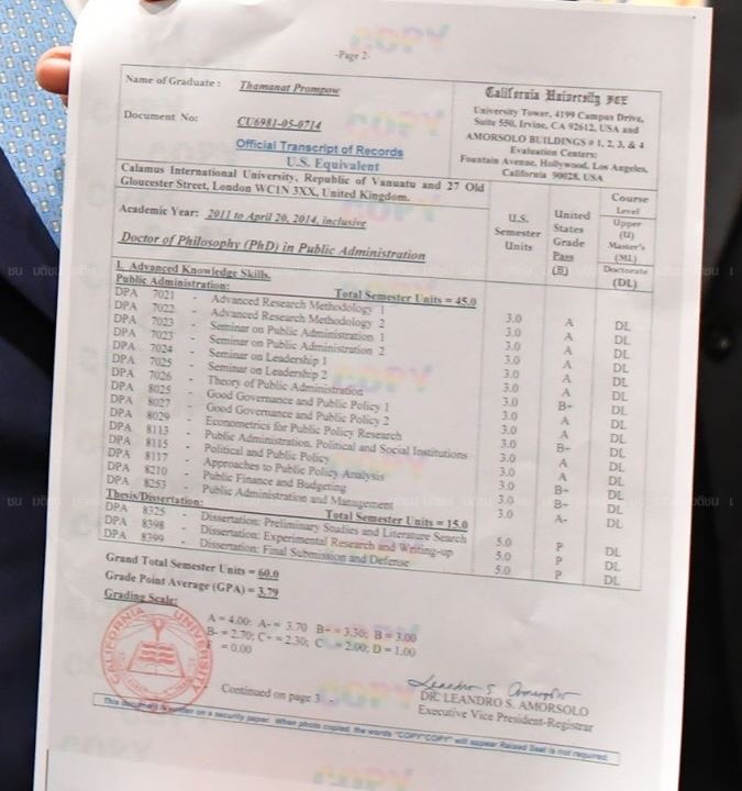 California University and Calamus International University, where drug smuggling Thai minister Thamanat Prompow claims to have got a PhD, are fraudulent diploma mills that sell worthless qualifications to people who want fake degrees.
