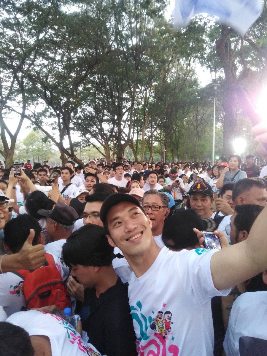 Opposition leader, Thanathorn, takes a selfie with supporters as Bangkok's "Run Against Dictatorship" begins. #วิ่งไล่ลุง
