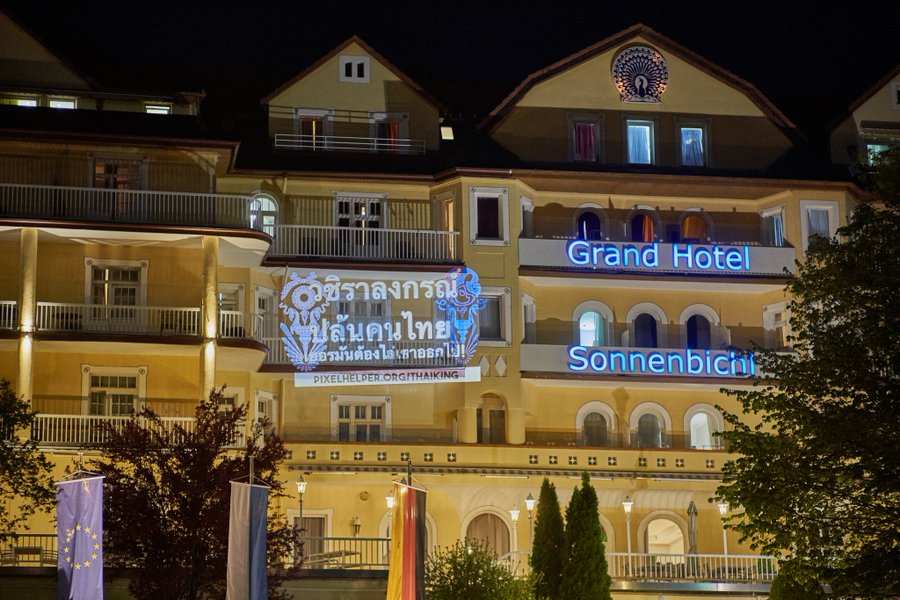 — Light attack on the Thai king: Human rights activist and light artist Dirk Martin Heinzelmann from the PixelHELPER Foundation fired protest messages into the royal rooms of the Grand Hotel Sonnenbichl shortly before midnight! —