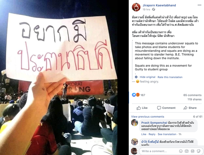 ผมไม่ทราบว่านี่เป็นเรื่องจริงหรือไม่ ก็ไม่แน่ใจอยู่เหมือนกัน แต่มันก็เป็นไปได้ที่จะมีการปฏิบัติการลับมาบั่นทอนการชุมนุมแบบนี้ แต่เราก็รู้กันดีว่า ผู้ประท้วงหลายคนมีความรู้สึกต่อต้านกษัตริย์วชิราลงกรณ์ และได้เอาป้ายวิจารณ์เขามาแสดงในที่ชุมนุมด้วย แม้ว่า ป้ายเหล่านั้นส่วนมากจะพูดกันแบบอ้อมๆ ใช้นัยยะแอบแฝง เพื่อเลี่ยงการเอ่ยชื่อเขากันตรงๆแบบโจ่งแจ้ง หากมีการปฏิบัติการลับโดยเจ้าหน้าที่นอกเครื่องแบบ เพื่อบั่นทอนเครดิตของการเคลื่อนไหวเหล่านี้ โดยเอาป้ายแสดงความเห็นยั่วยุปลุกปั่นมาใช้ มันเป็นการหักล้างความเข้าใจผิดพื้นฐาน ว่าผู้ประท้วงกำลังต่อสู้เพื่ออะไร
