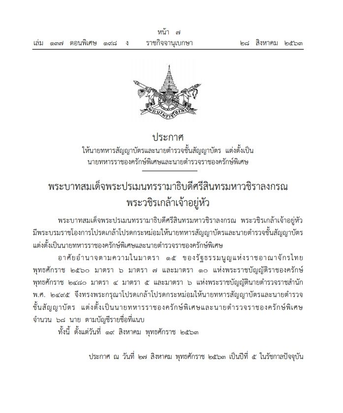พระบาทสมเด็จพระเจ้าอยู่หัว มีพระบรมราชโองการโปรดเกล้าฯ ให้นายทหารสัญญาบัตรและนายตำรวจชั้นสัญญาบัตร แต่งตั้งเป็นนายทหารราชองครักษ์พิเศษและนายตำรวจราชองครักษ์พิเศษ จำนวน 68 นาย ประกาศ ณ วันที่ 27 สิงหาคม 2563 เป็นปีที่ 5 ในรัชกาลปัจจุบัน