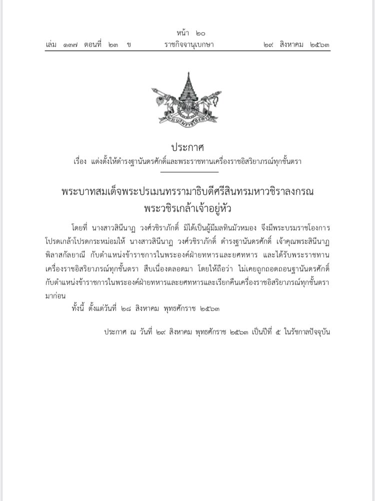 Sineenat “Koi” Wongvajirapakdi has been restored to her position as King Vajiralongkorn’s consort