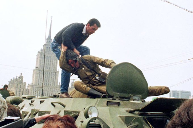 เมื่อวันที่ 19 สิงหาคม พ.ศ. 2534 ประชาชนฝ่ายประชาธิปไตยกำลังดึงทหารฝ่ายรัฐประหารของรัสเซียออกจากรถหุ้มเกราะทำให้การพยายามทำรัฐประหารโดยคณะนายทหารรัสเซียต้องล้มเหลวลงภายใน 2 วัน