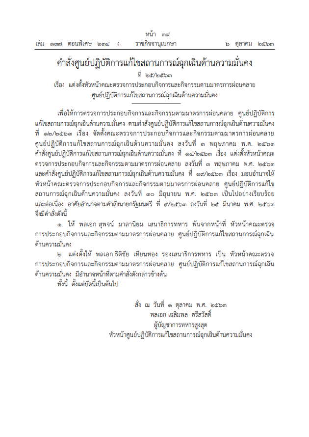นอกจากนี้ ผู้บัญชาการทหารสูงสุด ยังได้ลงนาม เรื่อง แต่งตั้งหัวหน้าคณะตรวจการประกอบกิจการและกิจกรรมตามมาตรการผ่อนคลายศูนย์ปฏิบัติการแก้ไขสถานการณ์ฉุกเฉินด้านความมั่นคงด้วย