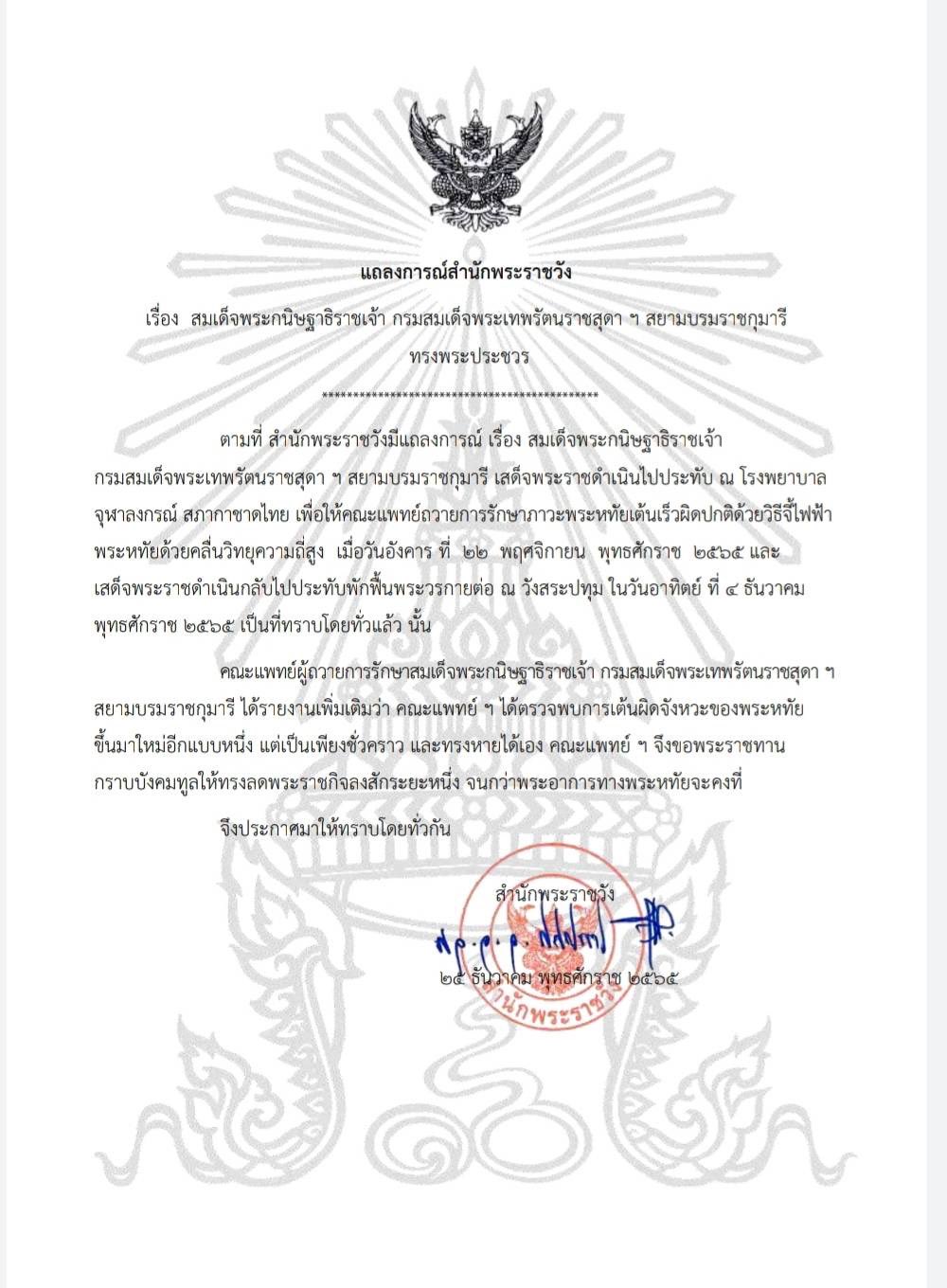 ตามที่ สำนักพระราชวังมีแถลงการณ์ เรื่อง สมเด็จพระกนิษฐาธิราชเจ้า กรมสมเด็จพระเทพรัตนราชสุดาฯสยามบรมราชกุมารี เสด็จพระราชดำเนินไปประทับ ณ โรงพยาบาลจุฬาลงกรณ์ สภากาชาดไทย เพื่อให้คณะแพทย์ถวายการรักษาภาวะพระหทัยเต้นเร็วผิดปกติด้วยวิธีจี้ไฟฟ้าพระหทัยด้วยคลื่นวิทยุความถี่สูง เมื่อวันอังคาร ที่ 22 พฤศจิกายน พุทธศักราช 2565 และเสด็จพระราชดำเนินกลับไปประทับพักฟื้นพระวรกายต่อ ณวังสระปทุม ในวันอาทิตย์ ที่ 4 ธันวาคม พุทธศักราช 2565 เป็นที่ทราบโดยทั่วแล้ว นั้น