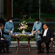 Macron and Xi drink tea in Guangzhou, China. Thibault Camus / AP