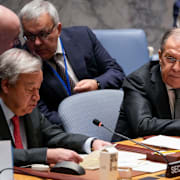Guterres and Lavrov next to each other during the Security Council meeting. John Minchillo / AP