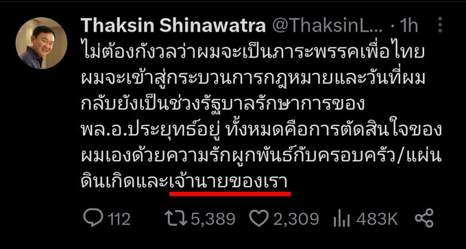 เคารพตัวเองบ้าง อะไรที่มันชัดเจนก็ไม่ควรต้องไปบิดเบือน "เจ้านายของเรา" ทักษิณหมายถึง วชิราลงกรณ์