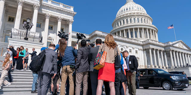 A group of reporters surround McHenry on Saturday. Jacquelyn Martin/AP