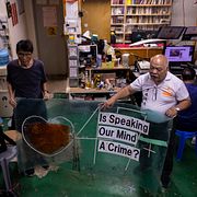 Tsang Kin-shing on the right at the announcement that the radio station is closing down. Louise Delmotte / AP