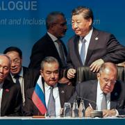 Chinese President Xi Jinping walks past Russian Foreign Minister Sergei Lavrov during the BRIC meeting last week. Marco Longari / AP