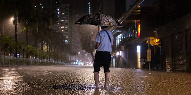A person waiting for the bus on a flooded street in Hong Kong. Louise Delmotte / AP