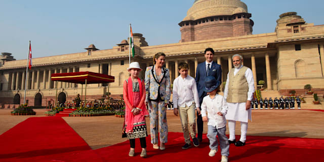 Indian Prime Minister Narendra Modi and Canadian Prime Minister Justin Trudeau, together with his wife and child. Archive image. Sean Kilpatrick/AP