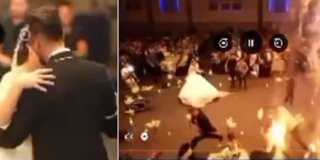 The couple were dancing with each other when flames suddenly shot up to the ceiling. Images on social media show burning parts from the ceiling falling towards the dancing bride and groom backing away.