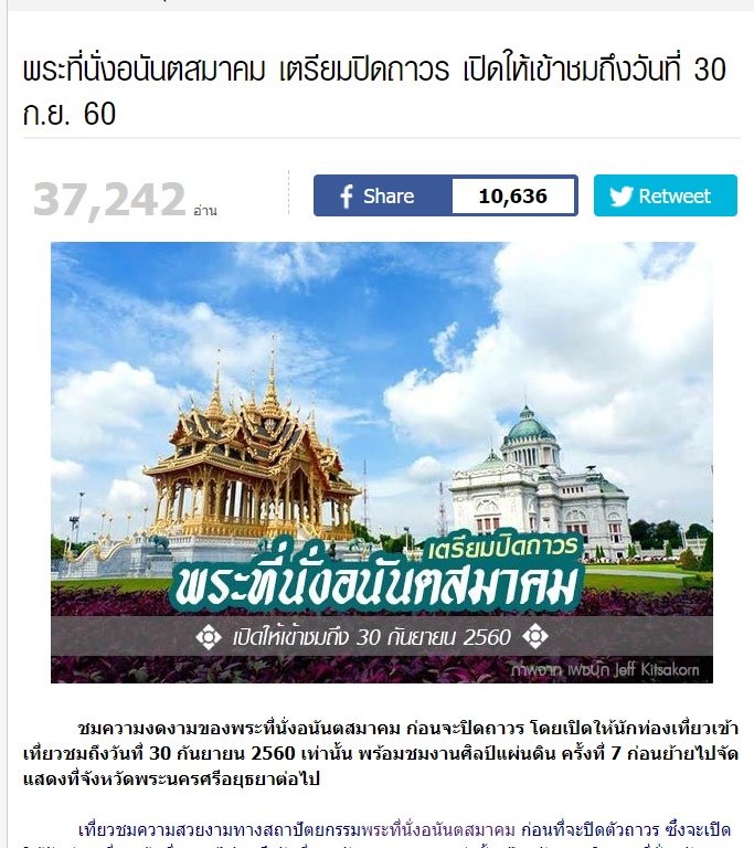 เมื่อวานนี้ มีข่าวออกมาว่า จะมีการ "ปิดถาวร" พระที่นั่งอนันตฯ ไม่ให้คนเข้าไปชมอีกแล้ว โดยไม่ได้บอกเหตุผล ใครอยากชมให้รีบๆไปเสีย ก่อนสิ้นเดือนนี้ (ดูภาพประกอบ หรือดูรายงานข่าวที่นี่ https://goo.gl/rveMkY)