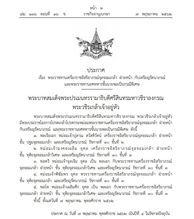 ประกาศ ณ วันที่ 7 พฤษภาคม พุทธศักราช 2562 เป็นปีที่ 4 ในรัชกาลปัจจุบัน