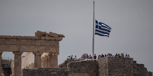 The Greek flag flies at half-mast at the Parthenon temple after the disaster. Petros Giannakouris / AP