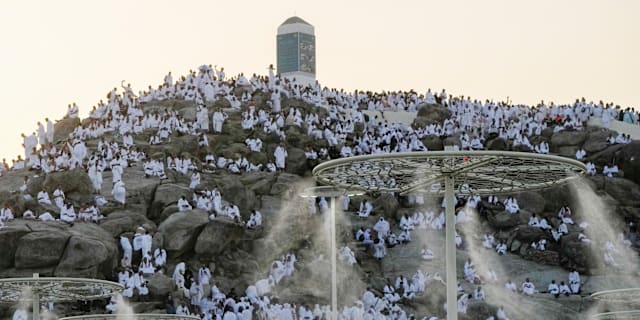 Water was sprinkled over the pilgrims on the mountain. Amr Nabil / AP